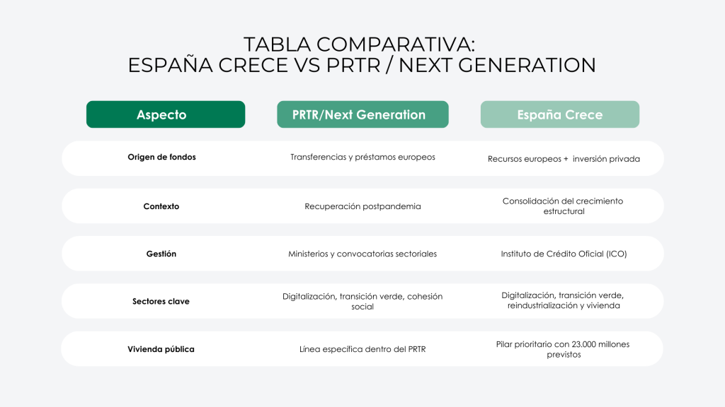 Tanto el PRTR como España Crece comparten la apuesta por la colaboración público privada. Igualmente, ambos instrumentos priorizan la transformación estructural frente a ayudas coyunturales. Sin embargo, España Crece no se limita a la lógica de recuperación postpandemia, sino que busca consolidar un modelo de inversión estable y sostenido en el tiempo.