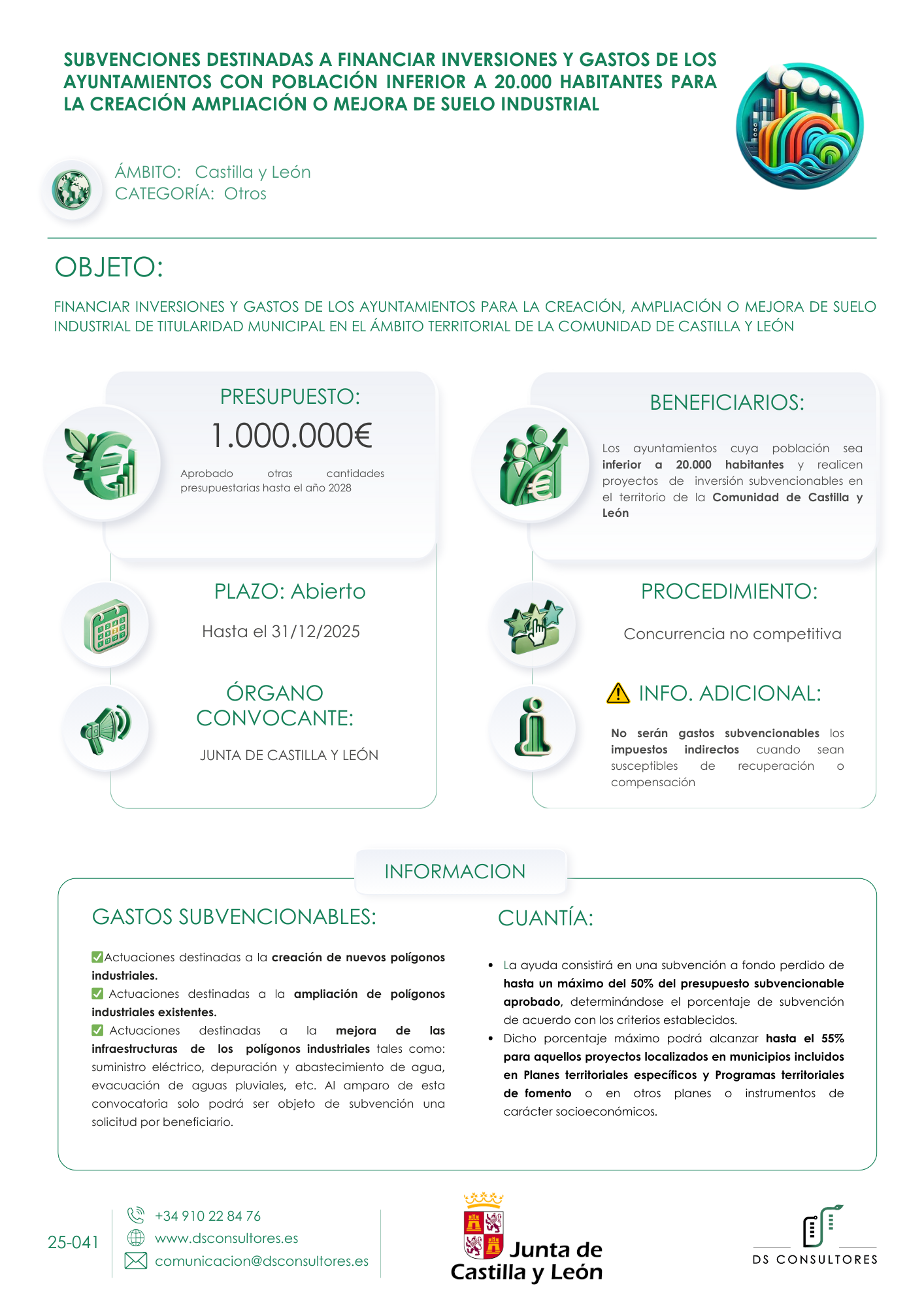 Subvención para creación, ampliación o mejora de suelo industrial municipal de Ayuntamientos con población inferior a 20.000 habitantes de Castilla y León